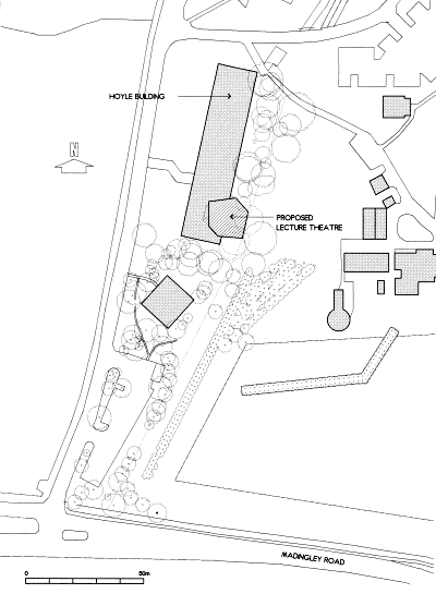 1. The Director of the Institute of Astronomy has brought forward proposals for the construction of a lecture theatre at the Hoyle Building of the Institute. At present, the only facility for lectures that the Institute possesses is a seminar room which holds some fifty people; this is seriously inadequate for the Institute's needs, and it is proposed to replace it by a lecture theatre with raked seating, accommodating an audience of about two hundred. The proposals also include provision for a committee room and an enlargement of the existing common room.