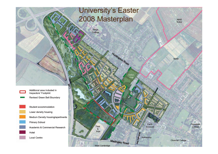 The Strategy Committee under the chairmanship of Mr Alexander Johnston and the Executive Group under the chairmanship of the Registrary have been meeting regularly to advance the objectives of the University with reference to its land holding at North West Cambridge. As the Council noted in its Notice of 7 January 2008 (Reporter, 2007–08, p. 392), the University sought the inclusion of its proposals for development of its North West Cambridge site in the draft Area Action Plan (AAP) prepared jointly by the City Council and South Cambridgeshire District Council. The draft document was submitted for examination on 19 May 2008 and, following a period of public consultation, the draft AAP was submitted by the local authorities in June 2008, on a basis however that did not reflect the University’s Easter 2008 Emerging Master Plan. Whilst there were substantial areas of agreement with the local authorities’ proposals, the principal difference related to the more restrictive development boundaries proposed in the draft AAP, which it was considered would result in the number of residential units falling significantly below the desired 2,500 residential units. Consequently within the public consultation period for the draft AAP running from 8 September to 20 October 2008, objections were lodged on behalf of the University, which together with others were the subject of consideration at the Examination Hearing in public before independent Inspectors appointed by the Secretary of State for Communities and Local Government which commenced on 25 November 2008. The purpose of the Hearing was to examine the ‘soundness’ of the draft AAP in terms of town planning and consider the various objections.