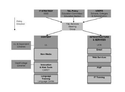 A long term plan for teaching and learning support must encompass the provision of content and the IT infrastructure needed to deliver it; the latter will require the involvement of all of the organisations described in section 3 above. Whilst the new Information Systems and Strategy Syndicate (ISSS) aims to supervise the University’s information strategy, there nevertheless remains an urgent need for greater coordination and integration of effort. The proposed new role for the UL would contribute importantly to improved communications and cooperation.