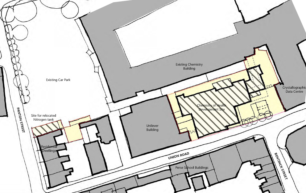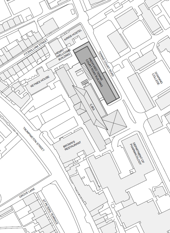 8. Drawings of the proposed development are displayed for the information of the University in the Schools Arcade. A plan showing the location of the proposed new building is shown below.