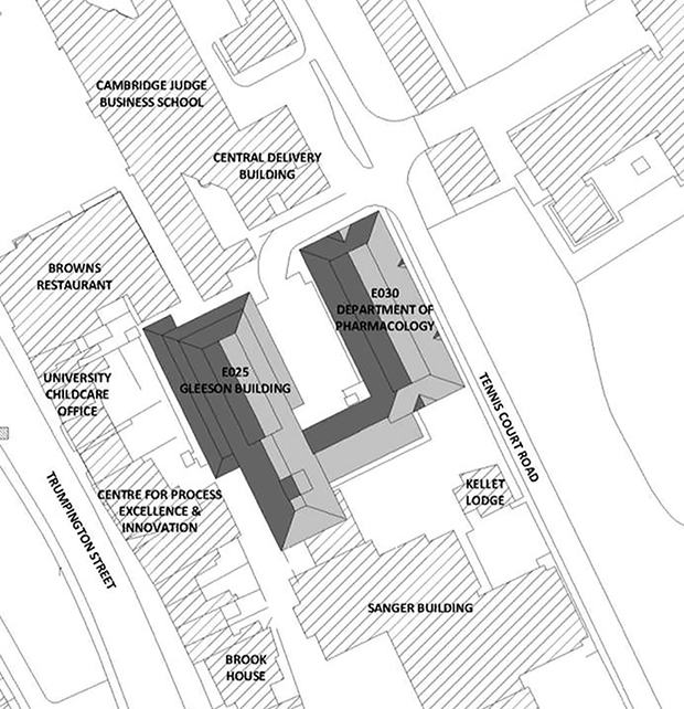 3. The MRC Toxicology Unit legally transferred to the University in March 2018. The Unit remains based in Leicester, in accommodation leased from the University of Leicester. It was agreed that space would be provided for the Unit in Cambridge, principally in a refurbished laboratory facility on Tennis Court Road (building E025 in the attached plan). Work will also be undertaken to improve links and create shared facilities with the Department of Pharmacology; some refurbishment within the Pharmacology Building (building E030 in the attached plan) will be required to accommodate activity dislocated by the core works. The building works proposed in this Report will support the development of the Cambridge Academy of Therapeutic Sciences, an initiative that promotes the development of therapeutics and the integration of industry into academic activities.