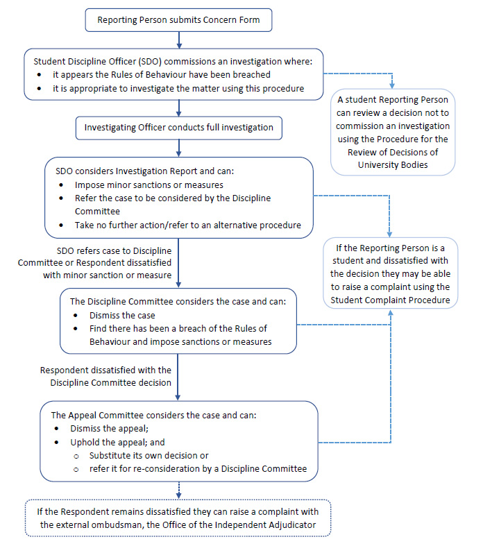 Members of the University are reminded that alleged breaches of the general regulations for discipline and other allegations of misconduct against the discipline of the University may be brought before the University Tribunal or a student disciplinary panel, as appropriate.