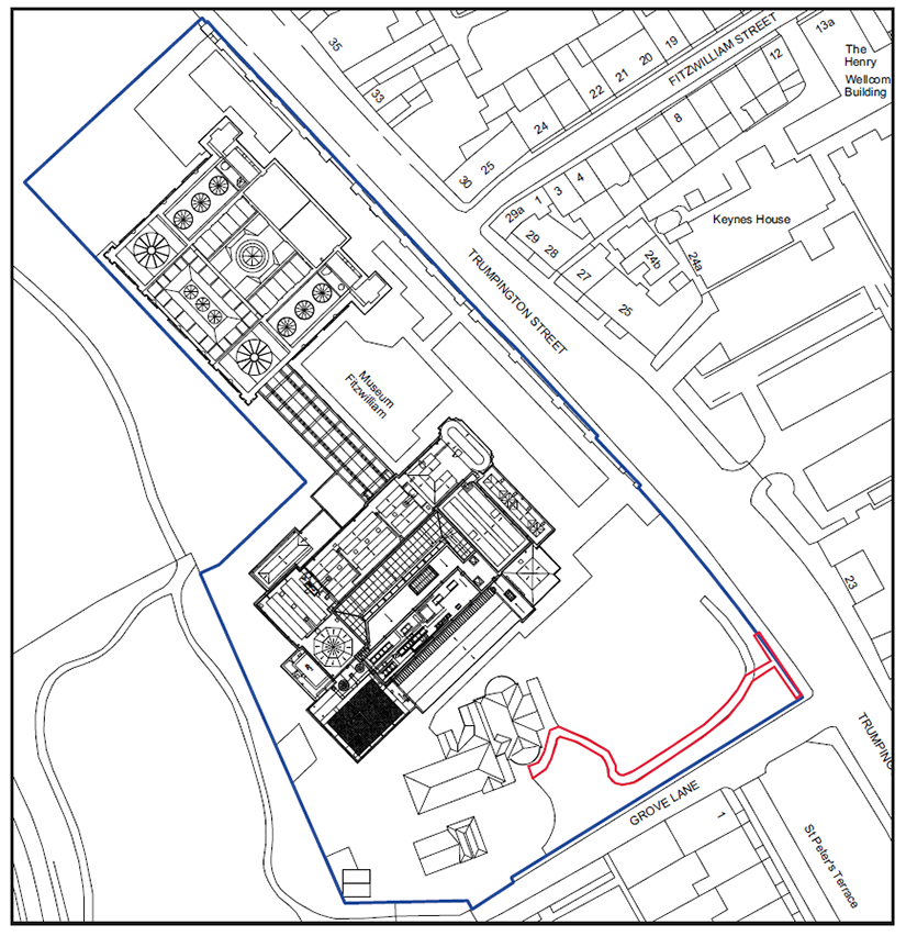 The Fitzwilliam Museum has identified a safety risk to Museum staff cycling or walking along Grove Lane, which has no designated pedestrian path and is used by vehicles accessing both the Museum and Peterhouse. To mitigate this risk, the Technical Sub‑committee of the Estates Committee has approved a minor works project to create a separate pedestrian route to Grove Lodge and other staff entrances to the Museum currently accessed via Grove Lane, as indicated in the drawing below.