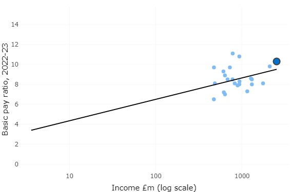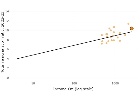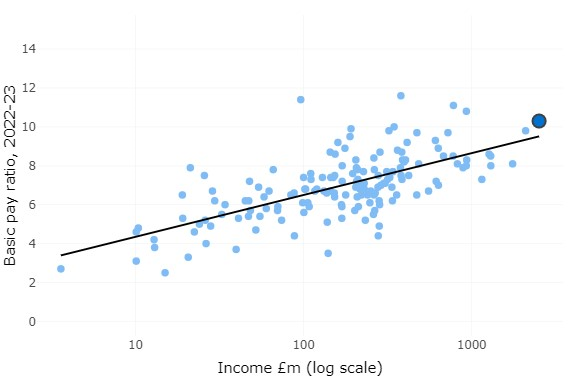 The Vice-Chancellor’s basic salary is 10.4 times (2023: 10.3 times and 2022: 10.5 times6) the median pay of staff, where the median pay is calculated on a full-time equivalent basis for the salaries paid by the University to its staff.