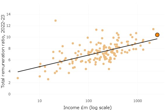 Comparative data for the sector is not yet available for 2023–24. However, through UCEA, the University has access to similar data for the year 2022–23. The two graphs below illustrate the 2022–23 (UCEA-sourced) data for both the University of Cambridge (highlighted) and all other UK Higher Education Institutions (HEIs). (Note: income refers to total income from across the University Group.)