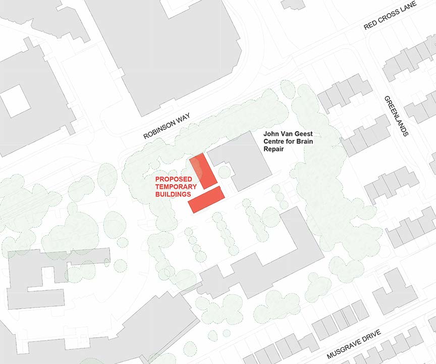 9. An alternative location on the Forvie site, adjacent to the John Van Geest Centre for Brain Repair, was endorsed by the Project Board Sub-Committee and the Project Board in November 2024. The plan below shows the revised location of the proposed temporary building (see p. 400).