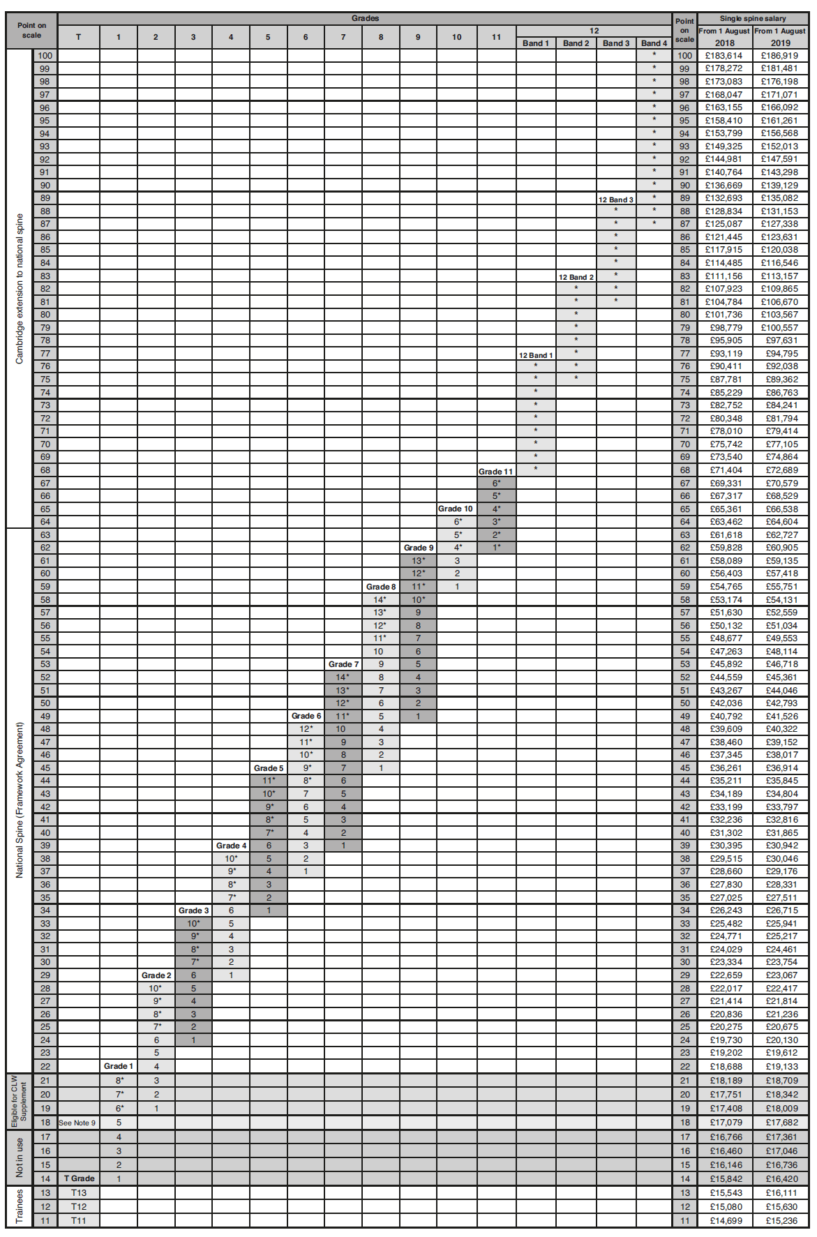 Note 12: Staff on spine points 18–21 are eligible for the Cambridge Living Wage (CLW) supplement.